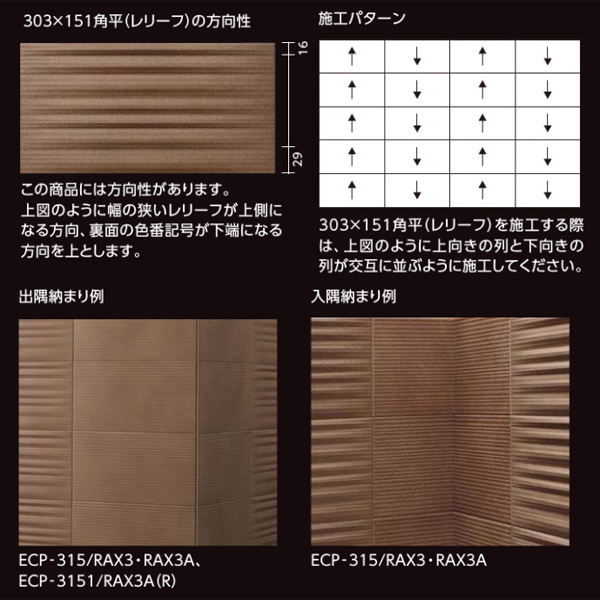 ・色番RAX1〜RAX4には上下に方向性がありますので、レリーフの上下を確認し、施工パターンに従って施工してください。