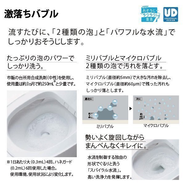 ※泡のクッションや便器・便座の形状でトビハネ・タレ・モレをおさえ、床・壁の汚れを抑制します。