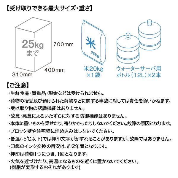 ■受取可能な荷物の最大サイズ:幅31×奥行40×高さ70cm 25kg以内