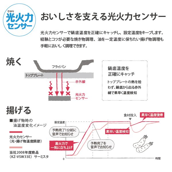 ※光火力センサーで鍋底温度を正確にキャッチし、設定温度をキープします。経験とコツが必要な焼き物調理、油を一定温度に保ちたい揚げ物調理も手軽においしく調理できます。
