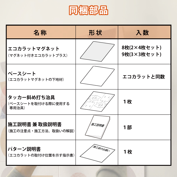 マグネット付エコカラット、ベースシート、施工用治具、施工説明書がセットになったキットです。