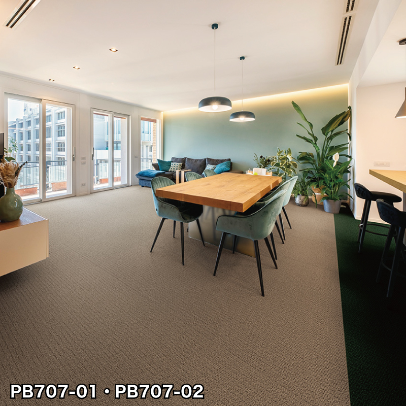 プレミアムバンクは、ウールならではの肌触りやウレタンパッキングの柔らかい踏み心地が特長のタイルカーペットシリーズです。